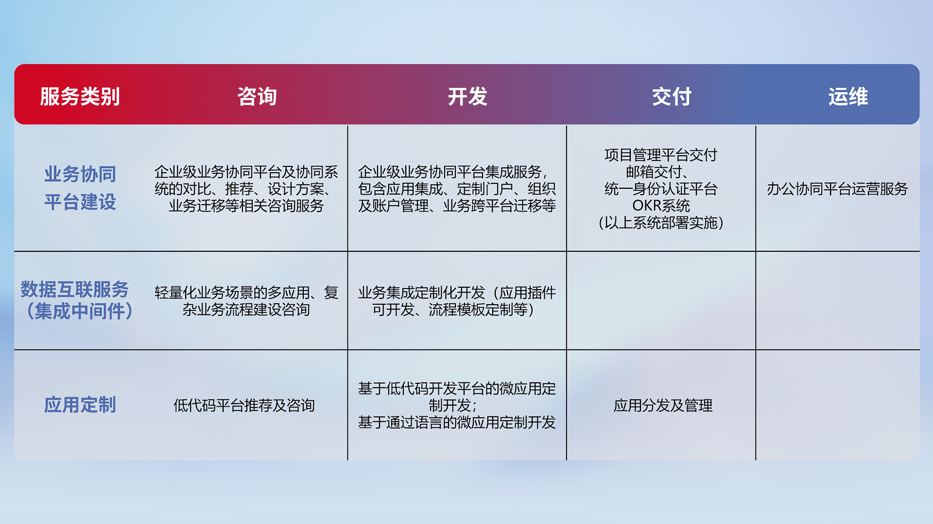 针对钉钉、、、企微、、、、IDaas等平台级产品提供产品的规划、、、方案、、交付、、、定制化开发等服务,,,实现如统一协同办公、、、智能客户服务、、混合会议管理、、、、智能数据查询、、、、等业务场景,,实现数字化转型。。。。