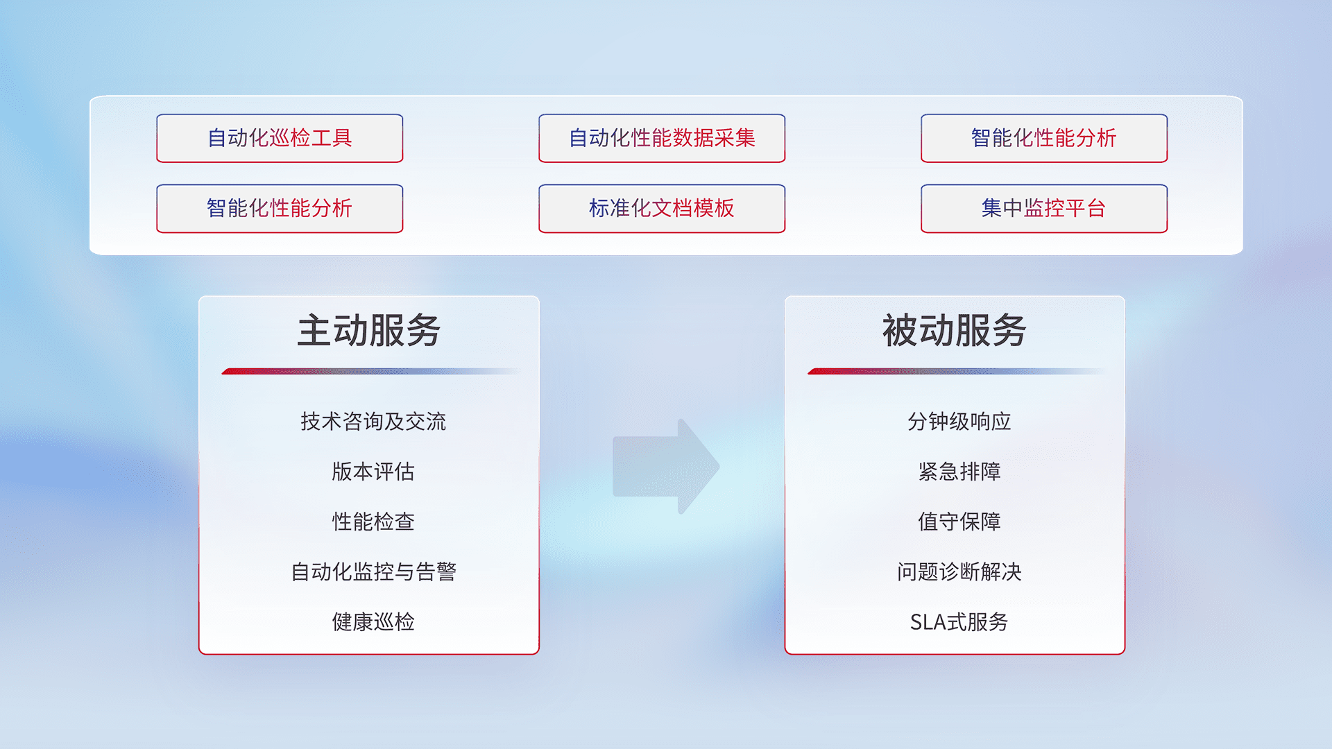 智能化工具和标准化文档,,保障服务质量,,,提供主动服务(包含技术咨询、、、版本评估、、、性能检查、、自动化监控与告警、、、健康巡检)和被动服务包含(分钟级响应、、紧急排障、、、、值守保障、、问题诊断解决、、、、SLA服务)。。。